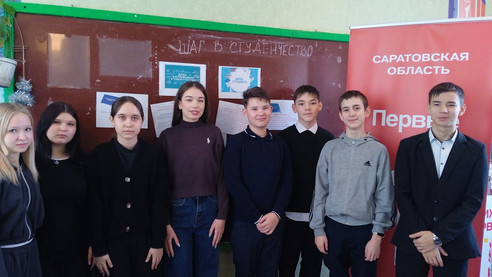 «Классная встреча» «Первых» из Новоалексеевской школы со студенткой СГУ.В преддверии Дня студента активисты первичного отделения Движения Первых школы села Новая Алексеевка приняли участие в общероссийской акции «Шаг в студенчество», организованной в формате #КласснаяВстреча.