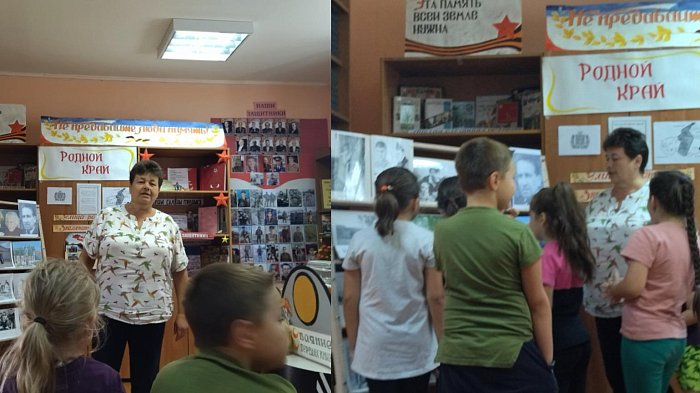 В свою очередь ребята, пользуясь выставкой «Эта память всей земле нужна», рассказали о нашем знаменитом земляке Клочкове Василии Георгиевиче. С помощью выставочного материала «Наши герои» библиотекарь рассказала о земляках, воевавших в Великую Отечественную войну.