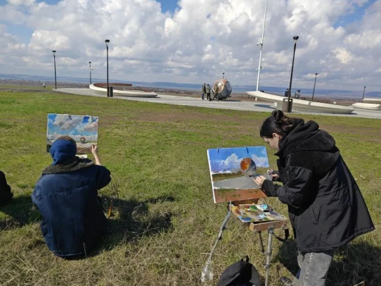 Будущие художники под руководством наставников выбирают натуру и приступили к эскизам пейзажей парка, его арт‑объектов и бескрайней степи — той самой, где 65 лет назад приземлился первый космонавт.
