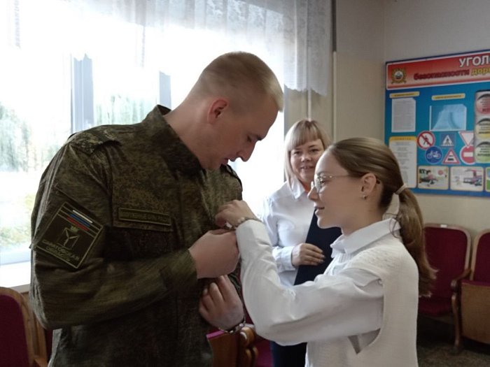 Началась встреча с торжественной линейки, наполненной гордостью и уважением. Ученица 6 “Б” класса Калинина Полина от всей души и с особым теплом вручила Александру подарок, сделанный своими руками – оберег, полный добрых пожеланий и поддержки.