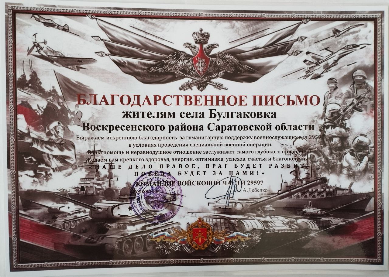 Командование воинской части 29597 в лице полковника А. Дебелко выразило искреннюю благодарность жителям села Булгаковка за гуманитарную поддержку военнослужащих в условиях проведения специальной военной операции.